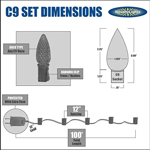 C9 Outdoor Ceramic Christmas String Light Set - Indoor/Outdoor Commercial Grade Set - Brown Wire - 100 Foot Novelty Lights presents this Christmas C9 string light set with 125 bulbs, perfect for outdoor patios, special event, or Christmas lighting. Typically you use these on your house roofline, on your Christmas tree, or around your patio to create a cheerful atmosphere. Each set includes 125 long life C9 bulbs on a Brown wire stringer with 100 sockets that are spaced 12" apart. We provide you with an extra 25 bulbs at no charge to be used for replacements. These durable Ceramic C9 light strings have long lasting 3,000 hour bulbs and are on a 20 gauge Brown wire. These durable and heavy duty C9 outdoor light strings will provide you with years of maintenance free use. C9 Ceramic 100 Socket and 125 Light Bulb Set 125 Long Life 3,000 Hour C9 Retro Bulbs 100 C9/E17 Intermediate Base Sockets Each C9 Bulb is 7 Watts This Set is Not Connectable End to End - Only 100' For Indoor and Outdoor use Nickel Coated E-17 Base Bulbs 20 Gauge SPT-1 Brown Wire 8-Amp Fused Plug General Mounting Tips: Always mount the string first before screwing in the light bulbs. For Outdoor Patios; We recommend using "aircraft wire" to use as support cable for a professional look and if you choose not to use a support wire then you can mount the string at various pivot points depending on your application. For rooflines; Mount along the roofline in accordance with our all in all clips (ASIN B004TNDB2I) to mount under shingles or on gutters which creates a strait secure line along your home. Your satisfaction is our #1 Priority and if you have any issue at please contact us and we would be happy to assist!