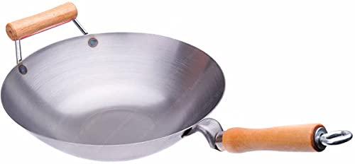 This heavy 14-gauge wok is an easy and fun to use. The natural, blond, wooden handle and side spool handle allows the cook full command of the wok. The flat bottom wok is designed to sit directly on an electric stove to take advantage of all the heat. Wok cooking is done with high heat. The flat bottom wok also works very efficiently on a gas stove. If cooking with gas, the same wok is available in round bottom. Wok measures 4" in depth. Cooking recommendations: 12" for up to 5 people, 14" for 6 to 12 people, and 16" for over 12 people. Must be seasoned.