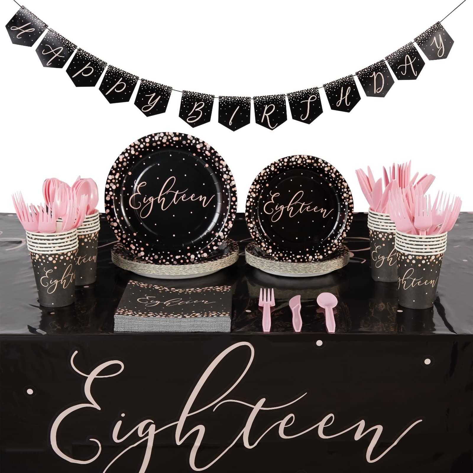 - 18th Birthday Decorations For Girls: Celebrate an 18th birthday with our all-inclusive decorations and dinnerware set for girls; this package includes 1 tablecloth, 1 banner, and a complete set of tableware for 24 guests, featuring dinner plates, appetizer plates, napkins, cups, spoons, forks, and knives totaling 170 pieces