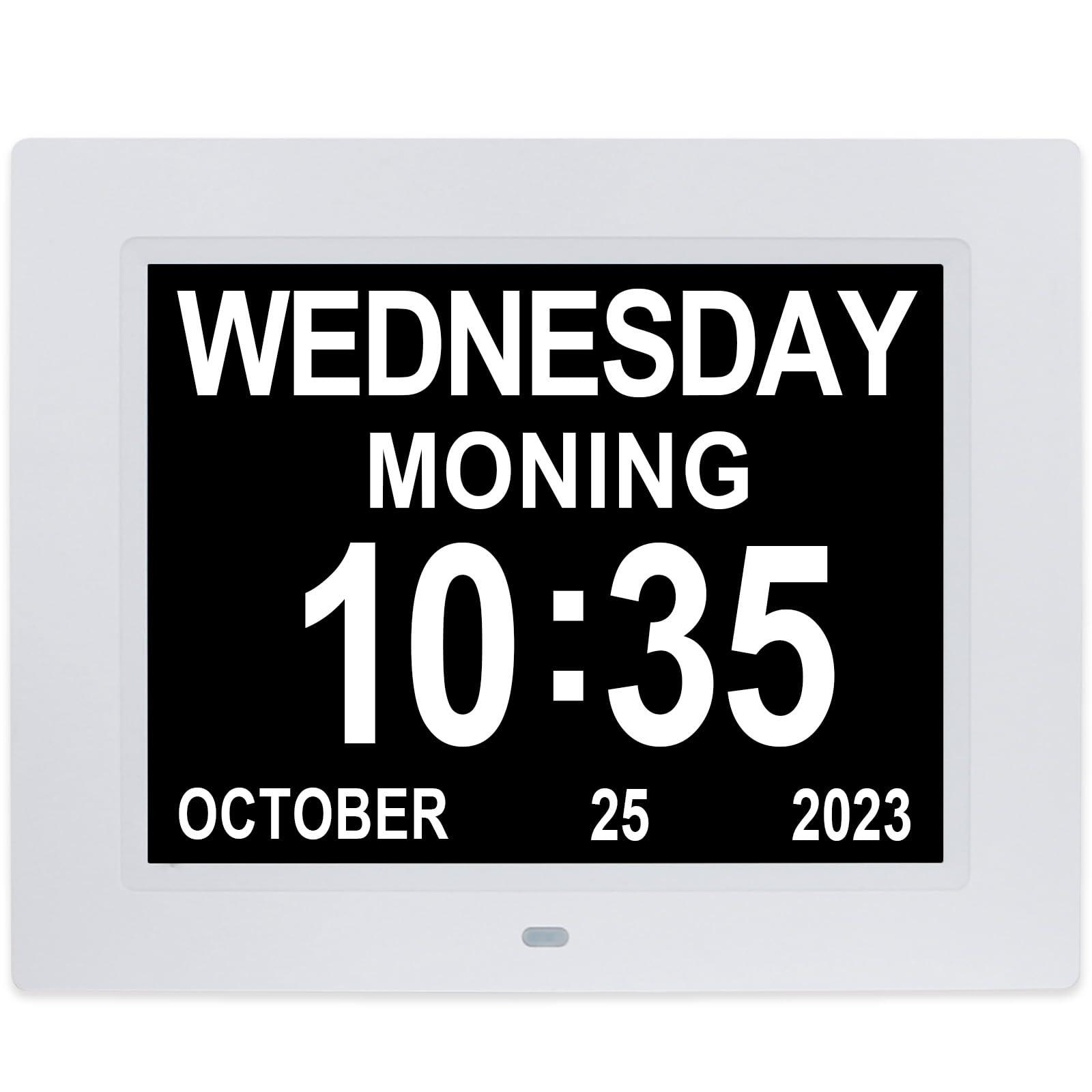 - DAY CLOCK FOR SENIOR CARE: 8 inch digital day calendar clock non-Abbreviated spells out the full DAY of the WEEK, MONTH and DATE in large; you can see the day date time clock hanging on the wall at the door of the room.