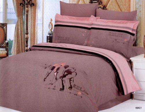 The grace of cotton meets with the elegance of Embroidery with this ensemble with hockey players embroidered on a Mauve-Pink backdrop that reverses to a solid Tan with black and dark tan stripes.. 6 Pieces Sports Theme Embroidered Duvet Cover Set. Fits Full or Queen Size mattress.. Made of 100% Soft Turkish Cotton at 305 Thread Count.. Set includes: 1 Flat bed sheet 1 Duvet Cover 2 Pillow Cases and 2 Pillow Shams.. The oversized flat sheet provides versatility; it can be tucked under the mattress or can hang with no need for bed skirt.. Concealed plastic snaps at the foot of the duvet cover make it easy to insert a comforter quilt or blanket.. Superior workmanship of combed yarns and sateen weaving produce a soft and lustrous look and eliminate typical wrinkling.. Printed with the latest reactive dyeing technology for excellent brightness and long lasting colors.. The sheets feel soft and inviting and are guaranteed for many years of reusable life.. The complete bedding set comes in an elegant gift box covered with glossy paper and tied with an ornamental bow.. The French Designer gift bag is also included in the bed in bag package.. Machine Washable: Normal w Cool Water - No bleach - Tumble Dry.. Imported.. Package Content and Sizes in Inches:- 1 Flat Bed Sheet 94 x 102- 1 Duvet Cover 80 x 87- 2 Pillow Cases 20 x 30- 2 Pillow Shams 20 x 30 + 2inch flangeNOTE: The digital images we display have the most accurate color possible. However due to differences in computer monitors we cannot be responsible for variations in color between the actual product and your screen.