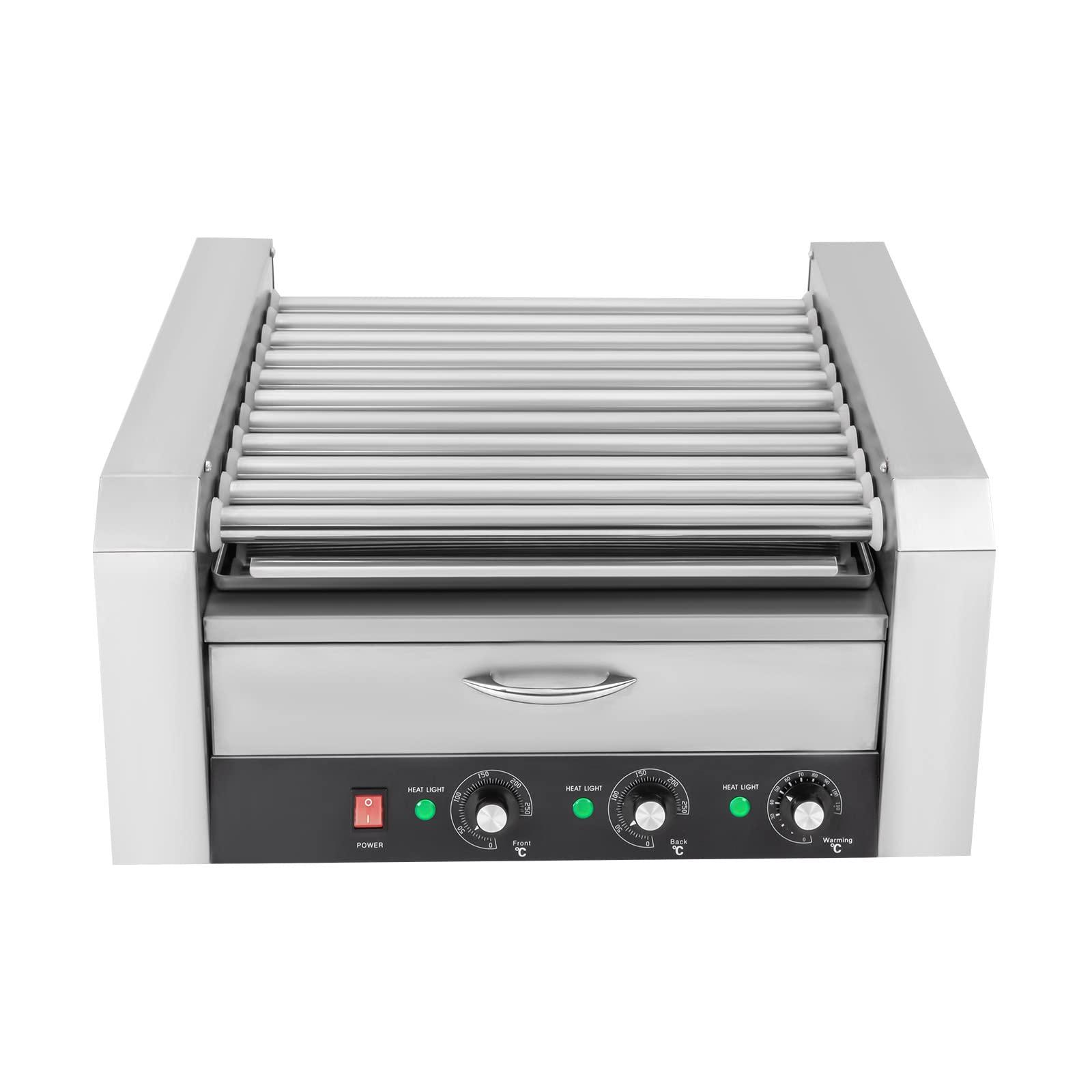 - Large CapacityWith a total of 11 long rollers (18.7inch) made of 210 stainless steel, it can bake 30 standard hot dogs at the same time, which can meet your commercial needs and save you lots of time. Meanwhile, the large drawer (9.5L/2.5gal) can store a lot of food to keep them warm.