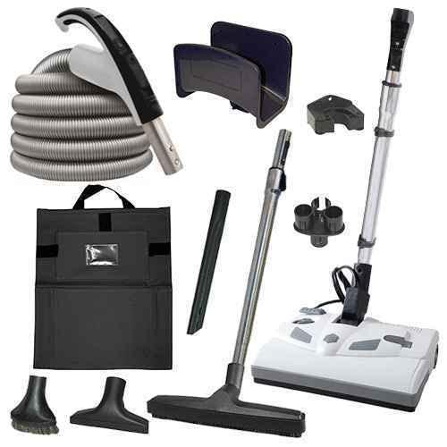 - 35 foot 3-way crush-proof lightweight electric central vacuum hose. Matte black colored power head. Comes complete with a 4 piece tool kit (12" Floor brush, crevice tool, upholstery tools and duster), telescopic wand for use with floor brush, caddy bag, wand tool caddy attachment, hose hanger, wall holder.