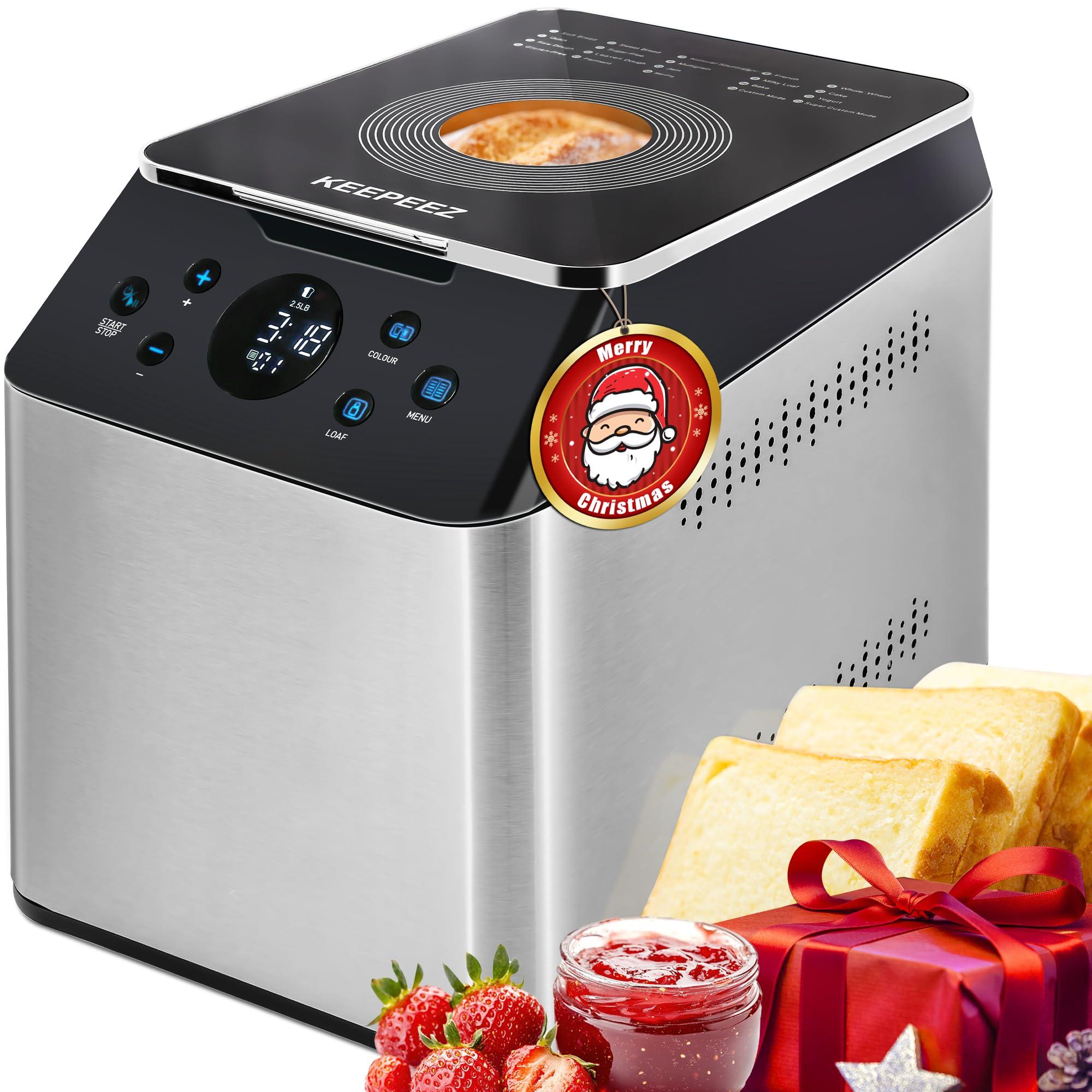 - SUPERIOR DOUBLE BAKING PRECISION & AUTO FRUIT NUT DISPENSER and 15H TIMER: Super stainless steel bread maker uses dual heaters for 360 even baking to ensure professional-grade breads with perfectly browned crustsevery time; light/medium/dark baking colors for crunchy, fluffy breads; suit family needs(2LB, 2.5LB, 3LB), KEEPEEZ bread machine fruit nut dispenser releases and distributes fruit and nuts at the optimal time; 15H timer for more flexibility in setting bread baking time; 1H keep warm function keeps bread fresh and flavorful.