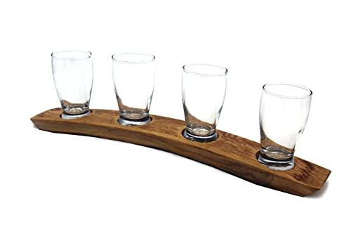 Our customers asked and we listened! We made a change to our popular 3-glass beer flights by adding an additional glass. Add that extra beer to your tasting menu with this 4-glass beer flight made from the stave of a French or Spanish wine barrel. The bottom of the stave showcases the rich red color of the wines that matured in the barrel. Beer tasting glasses are 5 oz. and are included. Length of the stave is approx. 17"L x 4"W. Available in Natural, Red Mahogany or Dark Walnut. The curve of the stave makes it easy to pick up and serve. Ask your favorite bartender or waitress/waiter. Theyll tell you!