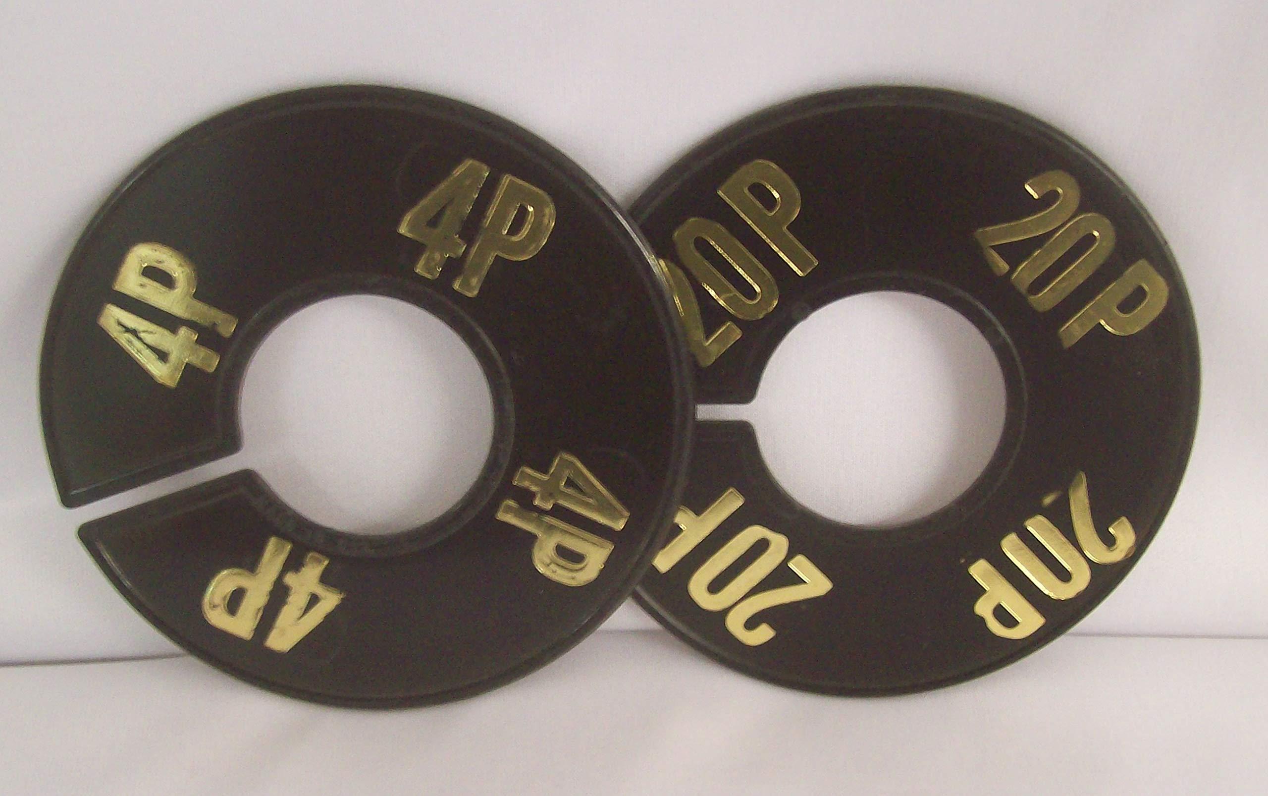 45 black round clothes sizers. Black with gold print. Includes 3 Each of: 4p,5p,7p,8p,9p,10p,11p, 12p,13p,14p,15p,16p,17p,18p, 20p. Fits 1" Round Hangrail. Fits 1" Square Hangrail. Printing on both sides.
