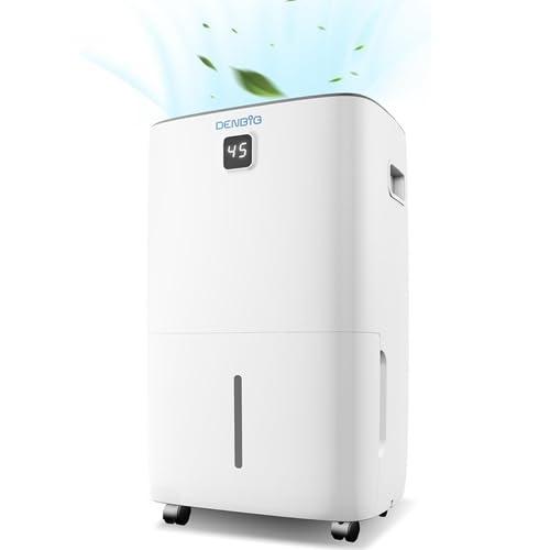 - EFFICIENT MOISTURE REMOVAL-DENBIG dehumidifier efficiently removes up to 50 pints of moisture per day. Covering areas up to 4,500 Sq.Ft, it maintains optimal humidity levels ranging from 35% to 80% RH. Perfect for basements, large and medium-sized rooms, and bathrooms.