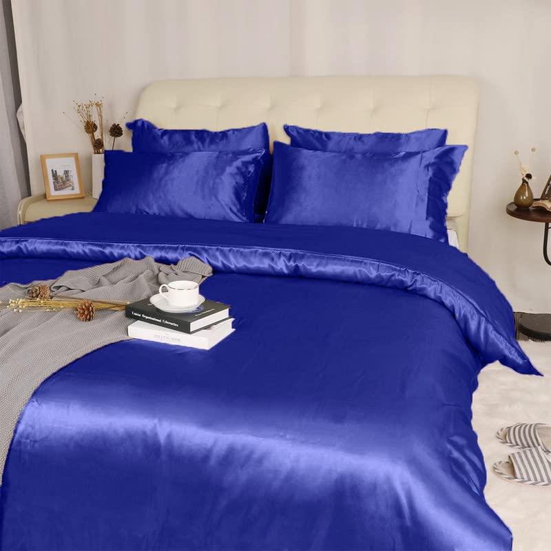 Roch Linen 7 Pc Silk Satin Sheet Set - Pure Silk Sheets - Silk Satin Fitted - Silk Satin Flat - Silk Satin Duvet Cover - Silk Satin Pillowcase - Skin Friendly Silk Satin Sheet Set - (Full Royal Blue)
