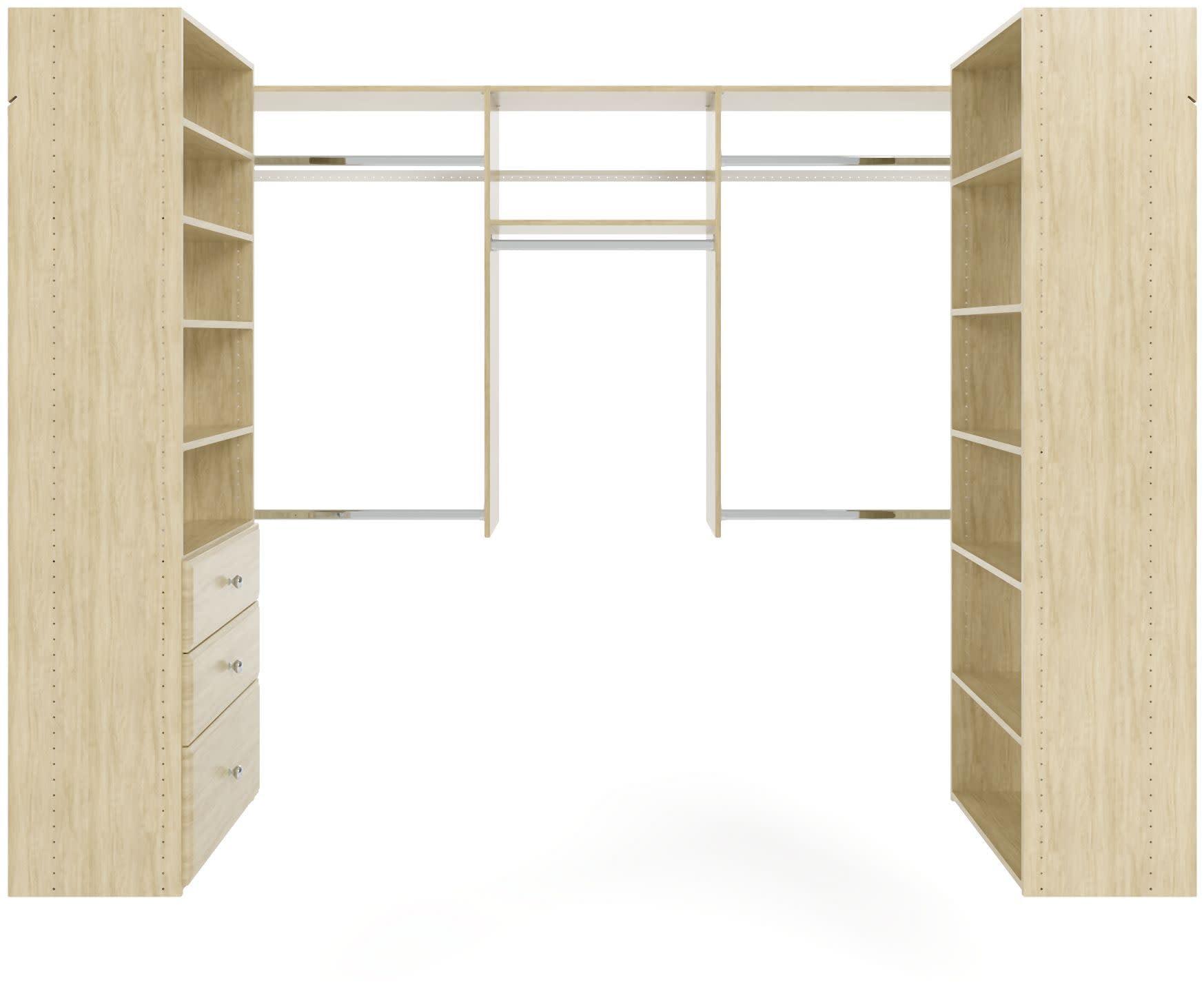 Looking for a storage solution designed just for you? Weve got your back. Easy Tracks U-Shaped closet kit was made to be your easy-to-install, walk-in dream! The three-kit combination includes double-hanging and long-hanging space for dresses, button ups and more. Shelving is included to hold sweaters, jeans, shoes and miscellaneous belongings. And for some hidden storage, three drawers. With this kit, youll be surrounded in organization in no time. Enjoy the durable, scratch-resistant laminate material and the timeless Honey Blonde finish. Ships in 9 cartons.
