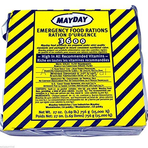 3600 Calorie Food Bar Includes One 3600 Calorie Food Bar with 9 Meals Per Bar! These food bars have a 5 Year Shelf Life! The 2400 and 3600 calorie bars are approved by the U.S. Coast Guard as well as the Canadian Transport Department and have a five year shelf life The new addition to our family is the 400 calorie food ration that is great for a single meal All Mayday food rations are baked under strict supervision and have a great taste of apple cinnamon shortbread Mayday food rations can be stored outside up to 149 degrees (F) and can be eaten without preparation Safe for vegetarians and anyone allergic to nut oils Specifications Dimensions: 6" x 6" x 1.25" Weight: 1 lb 12.6 oz