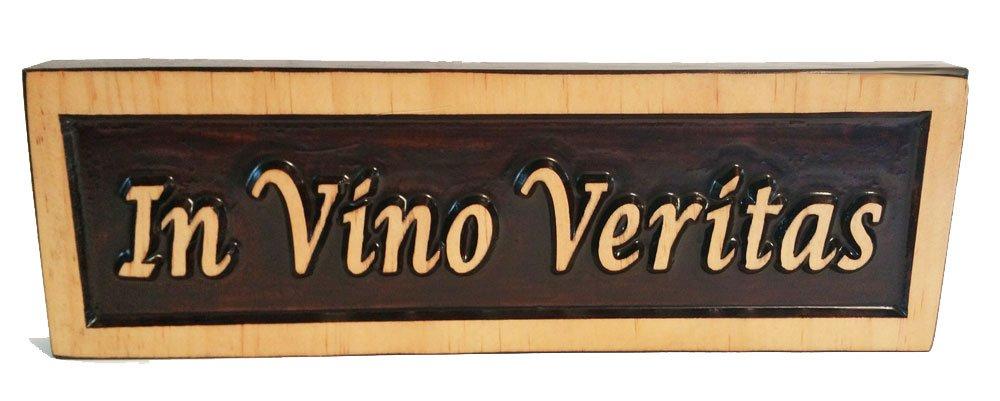 In Vino Veritas, In Wine there is Truth (Standard Text Version). A great conversation piece or desk plaque to share some humor. The piece is the size of a nameplate (3" x 10"). The plaque is freestanding and perfect for display on a desk, credenza, mantel, tabletop or bookcase. Great gift for a friend, colleague, employer, family member. The plaque is carved from 0.75 thick Clear Select Pine and is finished with a Two-Tone technique. The Two-Tone finish incorporates base coats of Mission Oak Poly Stain and finish coats of Classic Oak Satin Poly Stain. This technique beautifully highlights the carved details. No two pieces are the same. Each is made from hand select premium pine. The wood color, texture, and grain are carefully chosen to enhance the carving. The carving is hand sanded and finished with several coats of Poly Stain. Each piece is unique and carries the ABI Woodworking logo.