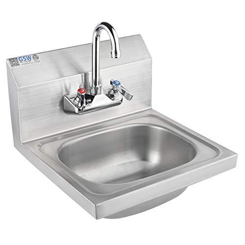 This standard wall mount stainless steel hand sink features a countertop edge with an offset to guard against drips and overflow and a 7-3/4" backsplash to help protect the wall. 2 pre-drilled holes on the backsplash to accommodate the included lead free gooseneck faucet. A strainer is also included. - 20 gauge type 304 stainless steel sink bowl, backsplash and top - Special polished satin finish - Well designed to be mounted to the wall - Pre-drilled holes with 4" centers on backsplash to accommodate the included gooseneck faucet - An opening(1-7/8" in Diameter) in the center of the sink bowl to accommodate the included strainer - ETL certified - Faucet & strainer included.