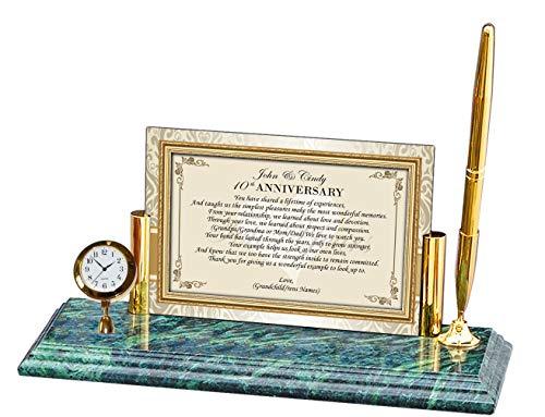 Parents Wedding Anniversary Poetry Mini Clock Genuine Marble Brass Pen Set Congratulation Present Mom Dad Mother Father Personalized Parents Anniversary Poetry Mini Desk Clock on Genuine Marble Base with Brass Pen. A unique desk pen set clock gift idea for mom and dad or parent's anniversary. Item GGA-BK Select a beautiful anniversary gift to celebrate a lifetime of love for your parents. The genuine marble base with mini gold clock features a personalized poetry panel with brass pen and metal gold brass accents. A handsome parents anniversary gift clock decor for any setting. Whether an anniversary or birthday, this personalized poetry clock gives a feeling of envy and elegance. The anniversary poem imprinted on the panel of the marble base compliments the traditions use of timeless designs. This poetry timepiece beautifully highlights the meaningful poem message that have sentimental value to the recipient. By fusing an anniversary poetry into a table desk clock with a touch of personalization, the end result is a really nice distinctive and unique anniversary gift for your parents or grandparents. After you place your order, email us through AchievementGifts (Amazon) or AllGiftFrames or amazon email and let us know. 1. What is the First Name of your grandparents? 2. Is this for 1st, 2nd, 7th, etc... Anniversary? 3. What are the name(s) who are giving this gift? Gold mini Clock size 1.5 inches. Overall Desk Accessory Display size 9 1/2"L x 3 1/2"D x 4 3/4"H.