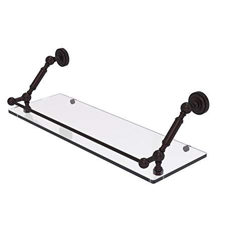 A floating shelf delivers a unique look to any bathroom or powder room. Unlike other shelves, the surface of our floating shelf is suspended below the arms instead of propped up by the brackets. This makes the shelf look like its floating in mid-air. The gallery rail on this shelf will keep your items and secure and in place. Our floating glass shelf features solid brass arms that reach down to the glass surface. Shelf also uses solid brass supports under the back edge of the glass for additional strength and support.