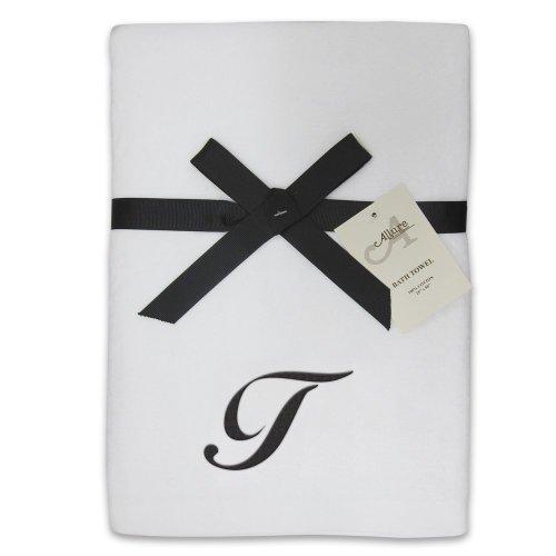 Allure Home Creations monogrammed velour bath towels in white are 100-Percent cotton. They measure 25-Inch by 50-Inch. They are packed as each with a .05-Inch black ribbon. Each towel is monogrammed with black lettering. The towels come in the top 12 letters that include B,C,D,J,K,L,M,P,R,S,T and W