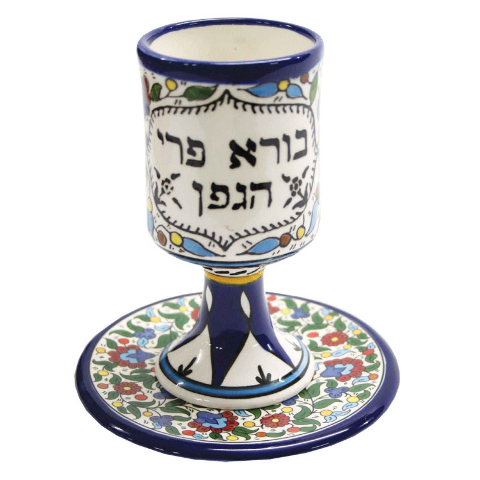 - This ceramic Kiddush cup with matching plate is sure to make your Shabbat table especially attractive.