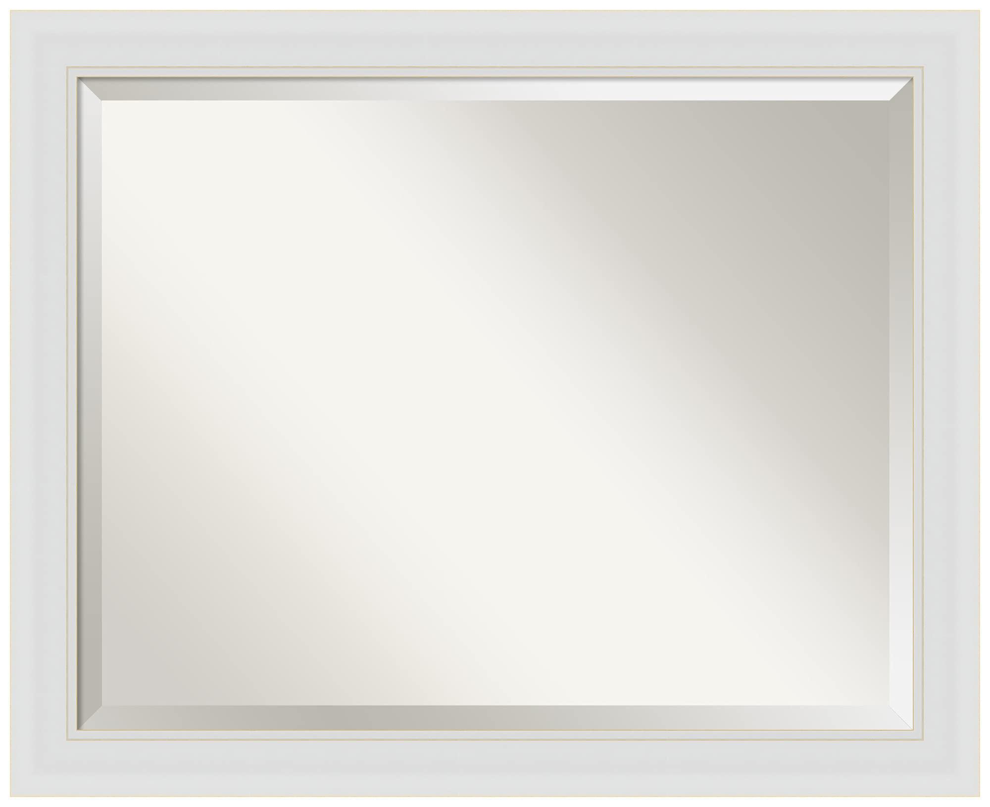 PRODUCT: Amanti Art Beveled Bathroom Wall Mirror; OUTER SIZE: 32 x 26 inches; FRAME: Flair Soft White Narrow 2.25"; FRAME FINISH: Satin; FRAME COLOR: White. The Flair Soft White frame features a soft white frame with a satin finish. Edge lines are rubbed and weathered to show the natural finish below. Give your bathroom the finishing touch with this framed wall mirror. Individually made using traditional custom framing techniques, it has the quality you would expect from your local frame shop. It holds its value with premium finishing that can be appreciated up close. Because of our attention to detail and focus on artistry, architects, interior designers, and homeowners alike choose this mirror to create beautiful living spaces.