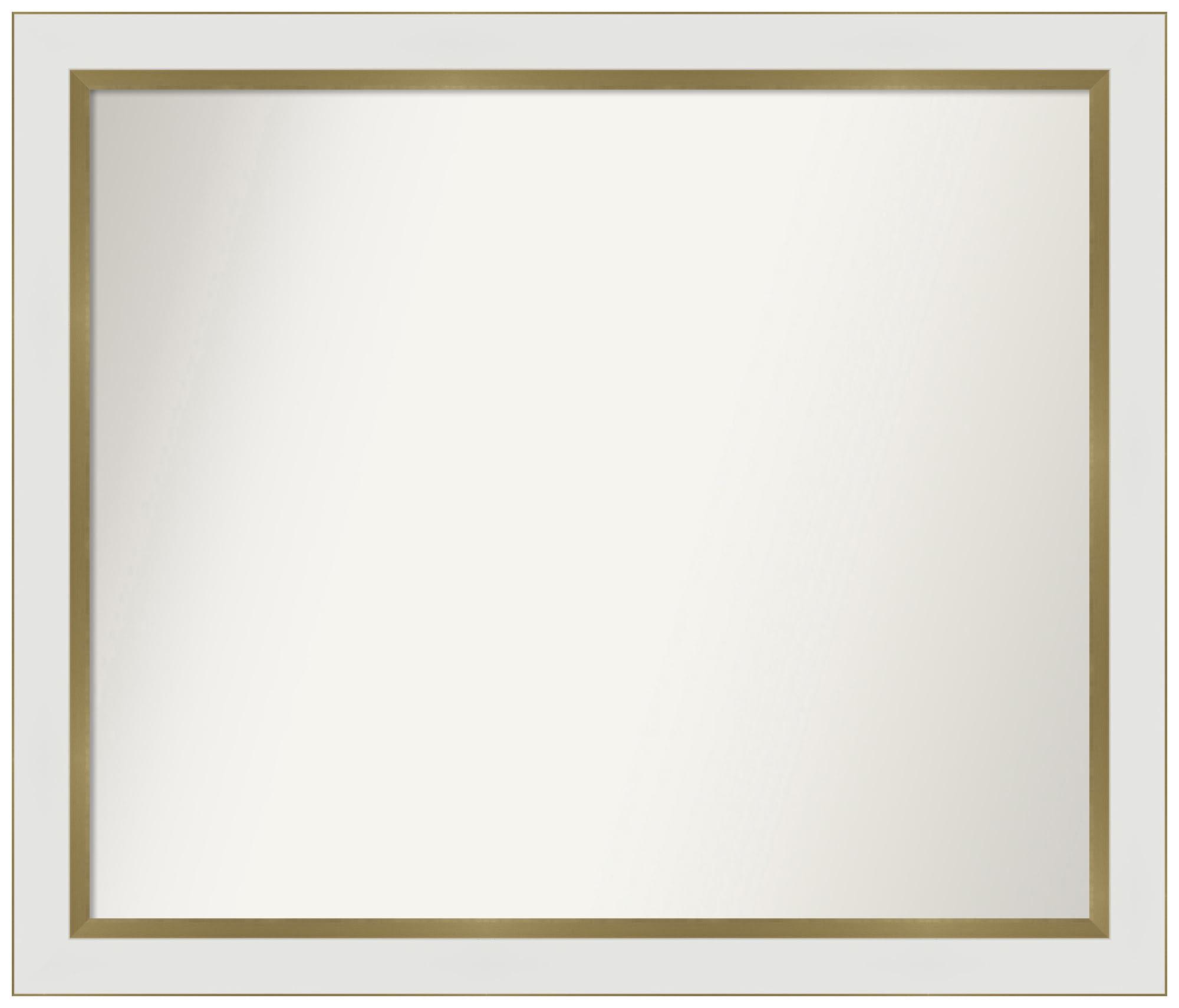 PRODUCT: Amanti Art Custom Mirror; OUTER SIZE: Exactly 27.25 x 23.25 inches; FRAME: Eva White Gold Narrow; FRAME FINISH: Matte; FRAME COLOR: White. The Eva White Gold Narrow frame is a smooth matte white, flat frame with a polished gold edge and recessed inner lip. Give your wall or bathroom the finishing touch with this framed mirror. Individually made using traditional custom framing techniques, it has the quality you would expect from your local frame shop and holds its value with premium finishing that can be appreciated up close. Because of our attention to detail and focus on artistry, architects, interior designers, and homeowners alike choose this mirror to create beautiful living spaces.