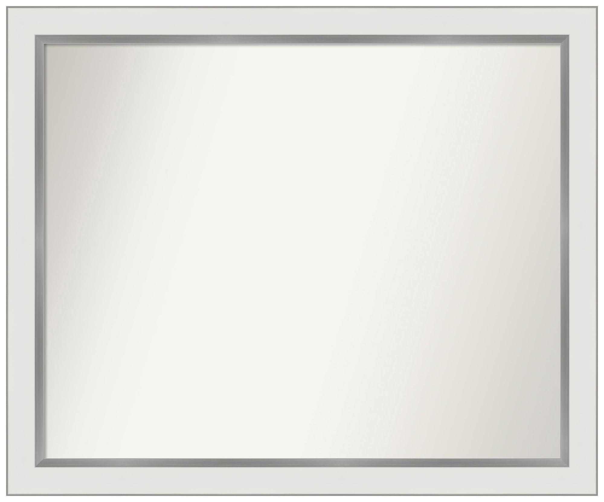 PRODUCT: Amanti Art Custom Mirror; OUTER SIZE: Exactly 29.25 x 24.25 inches; FRAME: Eva White Silver Narrow; FRAME FINISH: Matte; FRAME COLOR: White. The Eva White Silver Narrow frame is a smooth, matte white, flat frame with a polished silver edge and recessed inner lip. Give your wall or bathroom the finishing touch with this framed mirror. Individually made using traditional custom framing techniques, it has the quality you would expect from your local frame shop and holds its value with premium finishing that can be appreciated up close. Because of our attention to detail and focus on artistry, architects, interior designers, and homeowners alike choose this mirror to create beautiful living spaces.