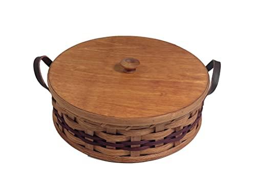 This Amish Single Pie Server Carrier Oak Wicker Basket with Leather Handles and Lid will protect your pies, desserts, casseroles, and other dishes during travel. The leather handles allow you to conveniently keep your pies secure while transporting them. This pie keeper basket has a 11" inside diameter so it can easily accommodate up to 10" pie plates with pies that are up to 3 1/2 tall. This Amish pie basket is designed so that you can serve your pie directly from the basket.