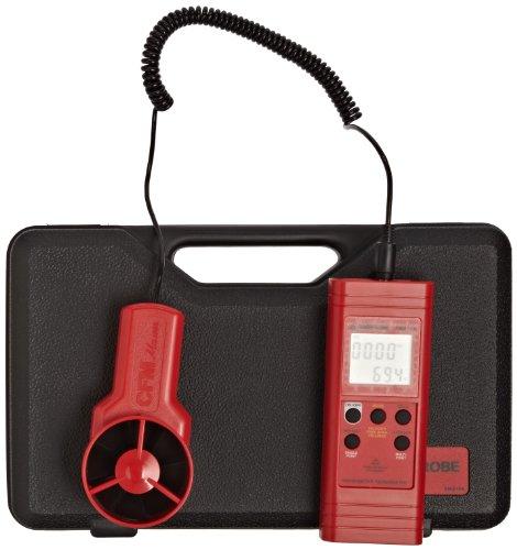 The meter measures single-point air flow source for continuous moving average for up to two hours or up to eight readings for multi-point sources, and has minimum, maximum, average, and hold functions for recording data. An RS232 port exports data. The meter requires one 9V battery (included), and includes a hard-sided carrying case, and instructions. Specifications Air velocity range 125 to 4900 ft/min (0.40 to 25.00 m/s) Air velocity accuracy + or - 2 percent of full scale Air flow range 1 to 9,999 CFM (0.01 to 99.99 CMS) Air flow accuracy 0 to 9.999 CFM/CMS Air temperature range 32 to 122 degrees F (0 to 50 degrees C) Air temperature accuracy + or - 1.5 degrees F (0.8 degree C) Resolution 0.01 m/s and CMS, 1 ft/min and CFM, 0.1 degree F/C Operating environment 32 to 122 degrees F (0 to 50 degrees C) at less than 80 percent relative humidity Dimensions (main instrument) 7.1 x 2.8 x 1.4 inches (181 x 71 x 38 mm) (H x W x D) Sensor head diameter 70 mm Weight (including battery and sensor) Approximately 0.8 lb. (363g)