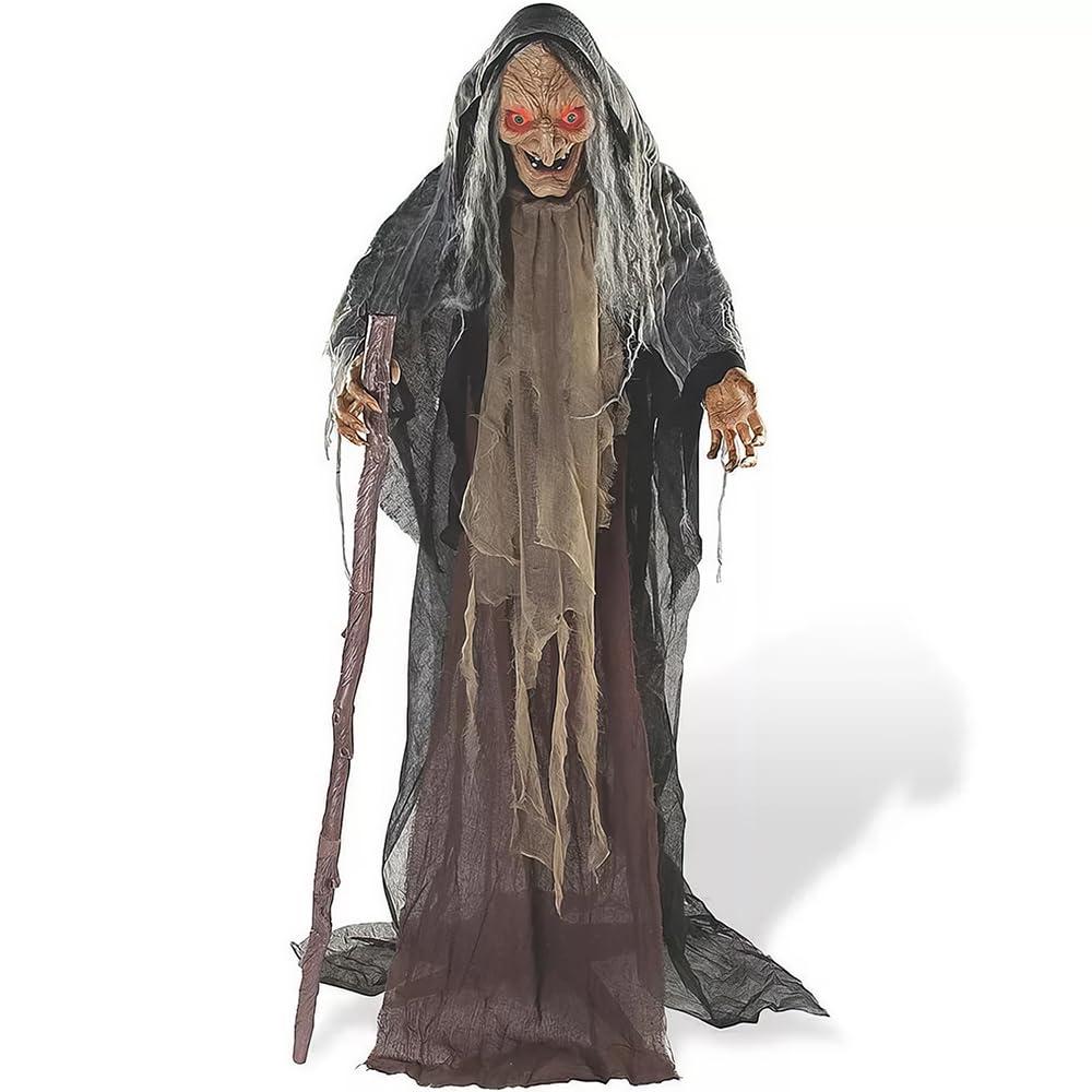 - Get ready to hear Hey! Did that witch just move?! This creepy Halloween decoration looks like an aged witch crouched over holding her cane