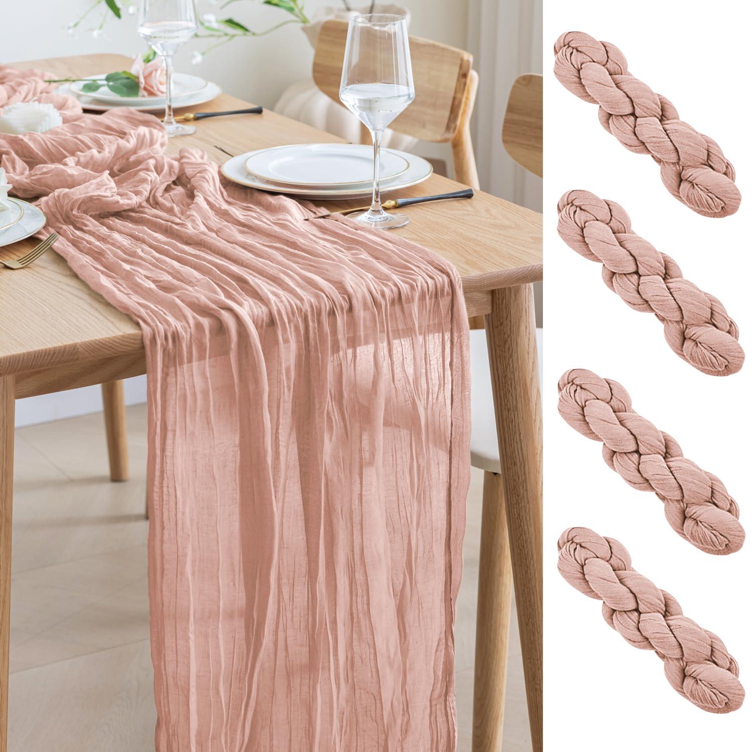 - Cheesecloth Table Runner Size: 35" W x 120" L. You will get 4 pieces 10FT length cheesecloth table runner. The sheer rustic table runner is long enough to span a large table and drape gracefully across the table. It will gently sway in the wind, adding a romantic atmosphere to your occasion. These eye-catching gauze table runners are ideal for arranging an elegant, stylish tablescape.