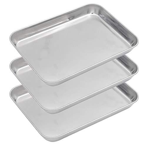 The baking pan are made of high quality pure 304 stainless steel without toxic chemical coating, free of rust and healthy for cooking. Stainless steel pan provides quick and even heating and cooling. The toaster oven pan is sturdy and smooth, it has shiny mirror finish, roll edges and no sharp angles. Full sides design for containing more food and preventing sauces from flowing everywhere, cooking and washing will be easier. This must be your best choice for baking and cooling bacons, vegetables, chicken wings, ribs, cookies, etc.