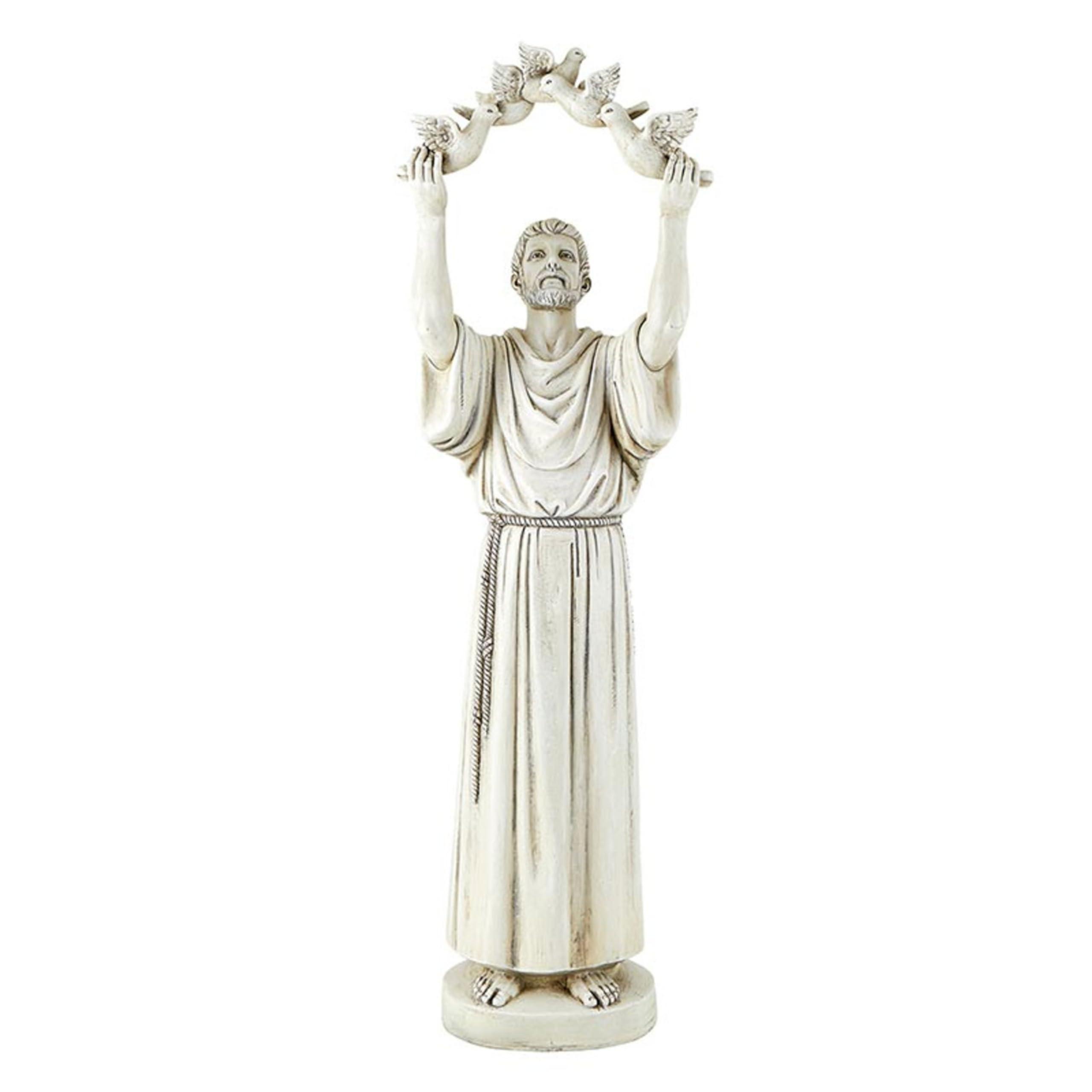 Celebrate the serene beauty of St. Francis with this 25.5-inch tall statue, featuring the saint with arms uplifted and an arc of doves between his hands. Crafted from long-lasting stone resin with a natural stone finish, this statue is perfect for both indoor and outdoor settings. It adds a touch of elegance and spirituality to any garden or home. Look for more exquisitely detailed figurines, plaques and decor that celebrate hope and Christianity from Avalon Gallery at Christian Brands Catholic, a Catholic owned and operated company with a heritage rich in tradition offering the finest selection of uplifting gifts and dcor for over 60 years.