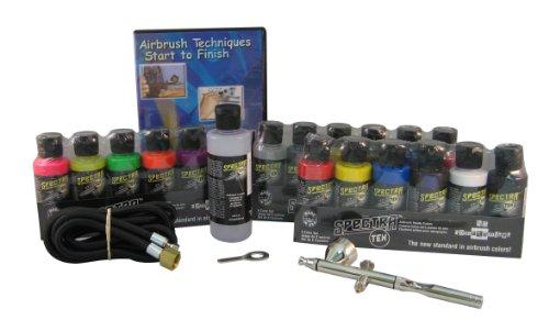 - Eighteen popular Spectra Tex airbrush-ready paints (primary set, neon set, metallic set); highly pigmented, professional grade; water-based acrylic, non-toxic; can be sprayed on fabric, wood, canvas, paper, and more with permanent results