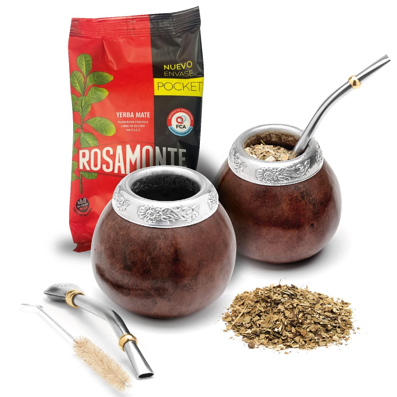 Includes all you need for an enjoyable Mate experience, handcrafted in Argentina with premium materials by local artisans. A great gift for any Yerba Mate lover! Includes: 2 Mate Gourds. 2 Bombillas (Mate straws). 1 Cleaning Brush Yerba Mate Bag Instructions manual. Each purchase is packed beautifully and includes a step-by-step manual with clear instructions on how to cure, prepare, maintain your Gourd for the best taste and experience. TRADITIONAL MATE SET -This yerba mate tea set includes: 100gr Yerba Mate bag by Rosamonte, 2 natural handmade mate gourds - Mate cup (Calabaza) with a carved design ring rim, 2 bombillas (mate straw) with removable filter head for optimal cleaning and a brush. Please read the included manual with clear instructions before any use for a long lasting product. NATURALLY AUTHENTIC -Authentic handcrafted in Argentina mate y bombilla. No machines, a unique style and artwork making each piece unique. Each Calabash Gourd grows uniquely, at his time and form. No two are the same. Some are bigger, some are smaller. Nature does not repeat - it creates. Years pass by and every sip brings sweet memories and special feelings with a unique taste that only a natural Gourd can provide. Contains approximately 7 oz I 200 ml. The Bombilla Is 5.5 inch I 14 cm long. GREAT GIFT -The real way to enjoy the Mate experience is in a natural mate cup and bombilla, a great way to drink it traditionally or as an south american souvenir made of a complete natural fruit. The Brown color comes as a result of the roasting of the fruit. The fruit provides an exquisite taste to the beverage. It is an ideal product for personal use or as a beautiful gift. RICH HISTORY & KNOWN-BENEFITS -The Calabash Gourd is generally made from a kind of "pumpkin" called Lagenaria. Being made of a complete natural fruit the gourd yerba mate must be cured, to seal the pores, avoid bitterness and cracks. The packaging includes a manual in Spanish and English with clear instructions how to cure and prepare it for the best mate bombilla experience! SATISFACTION GUARANTEED AND CUSTOMER SERVICE If you need personal assistance on order information, shipping or anything else, dont hesitate to reach out. Your satisfaction is our main priority.