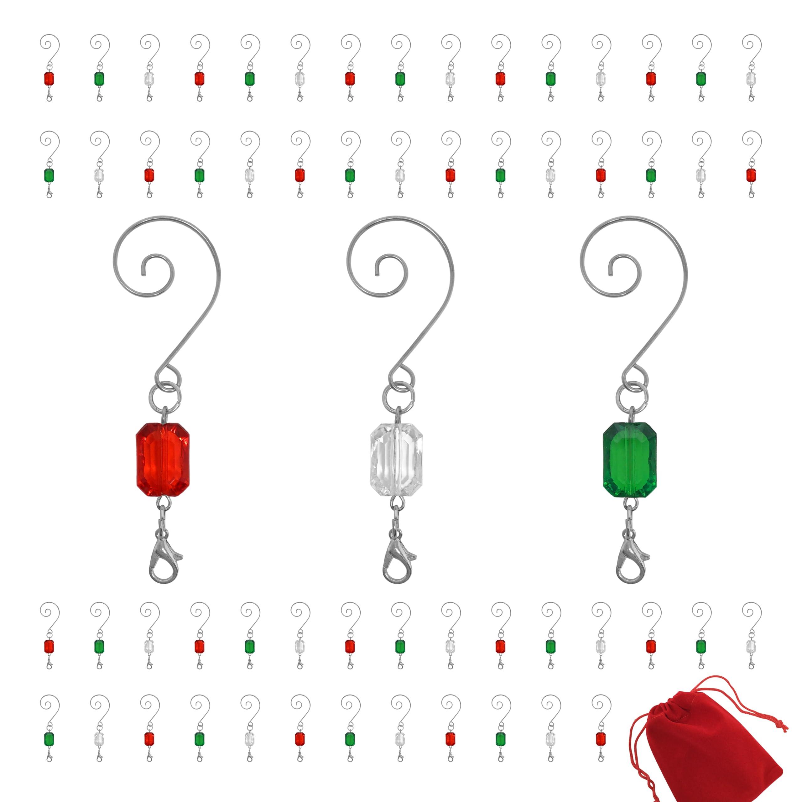 - CHRISTMAS ORNAMENT HOOKS. Decorate your home for the holidays with a set of 120 ornate ornament hangers. This hook set has 40 RED, 40 GREEN and 40 CLEAR acrylic gem beads fastened to durable stainless steel hooks and spring loaded clasps.