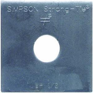 Bearing PlateBearing plates give greater bearing surface than standard cut washers and help distribute the load at these critical connections.No. BP1/2: 3/16 IN thick uncoated steel, 2 IN W. x 2 IN L.; install with 1/2 IN diameter boltNo. BP 1/2HDG: 3/16 IN thick hot-dip galvanized steel, 2 IN W. x 2 IN L.; install with 1/2 IN diameter bolt.No. BP1/2-3HDG: 3-gauge hot-dip galvanized coated steel, 3 IN W. x 3 IN L.; install with 1/2 IN diameter boltView Simpson Strong Ties website for details and warranty information on this product.