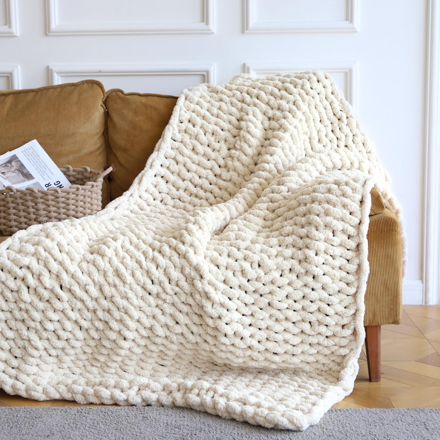 - [Extra Softness Throw Blnaket] - Our chunky knit throw blanket is knitted with super soft cotton chenille yarn which makes you feel fuzzy against the skin and keeps you warm and comfy. The chenille chunky knit blanket can cover and offer a full body hug to make you comfy and cozy.
