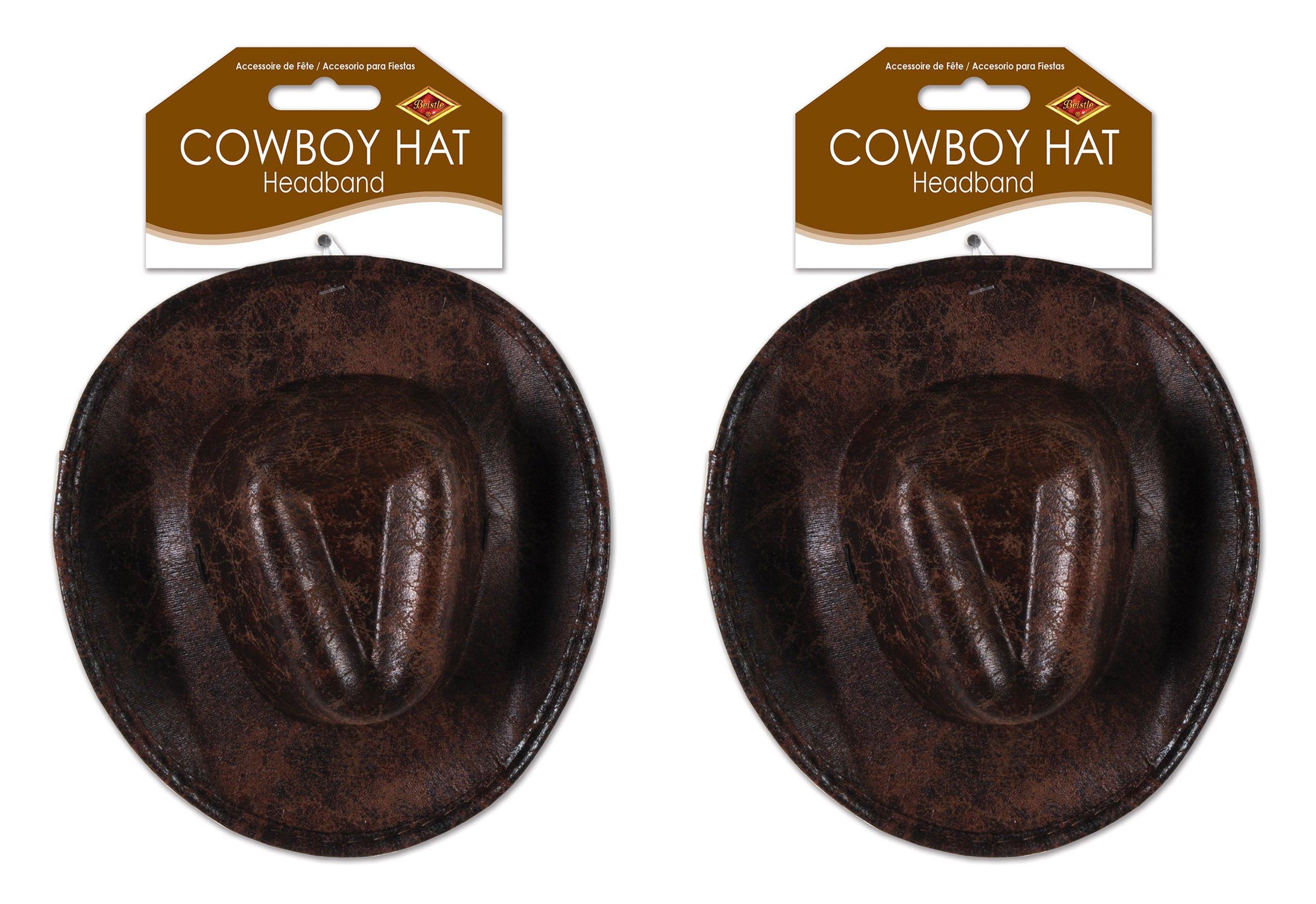 Beistle 53336 cowboy hat headband. The package contains 2 headbands. The Brown fabric covered headbands have mini faux leather Brown cowboy hats attached. The cowboy hats measure approximately 6 inches wide by 3 inches tall. The headbands are one size fits most. Wear these headbands for a western themed party! also goes well as an accessory for a Halloween costume!