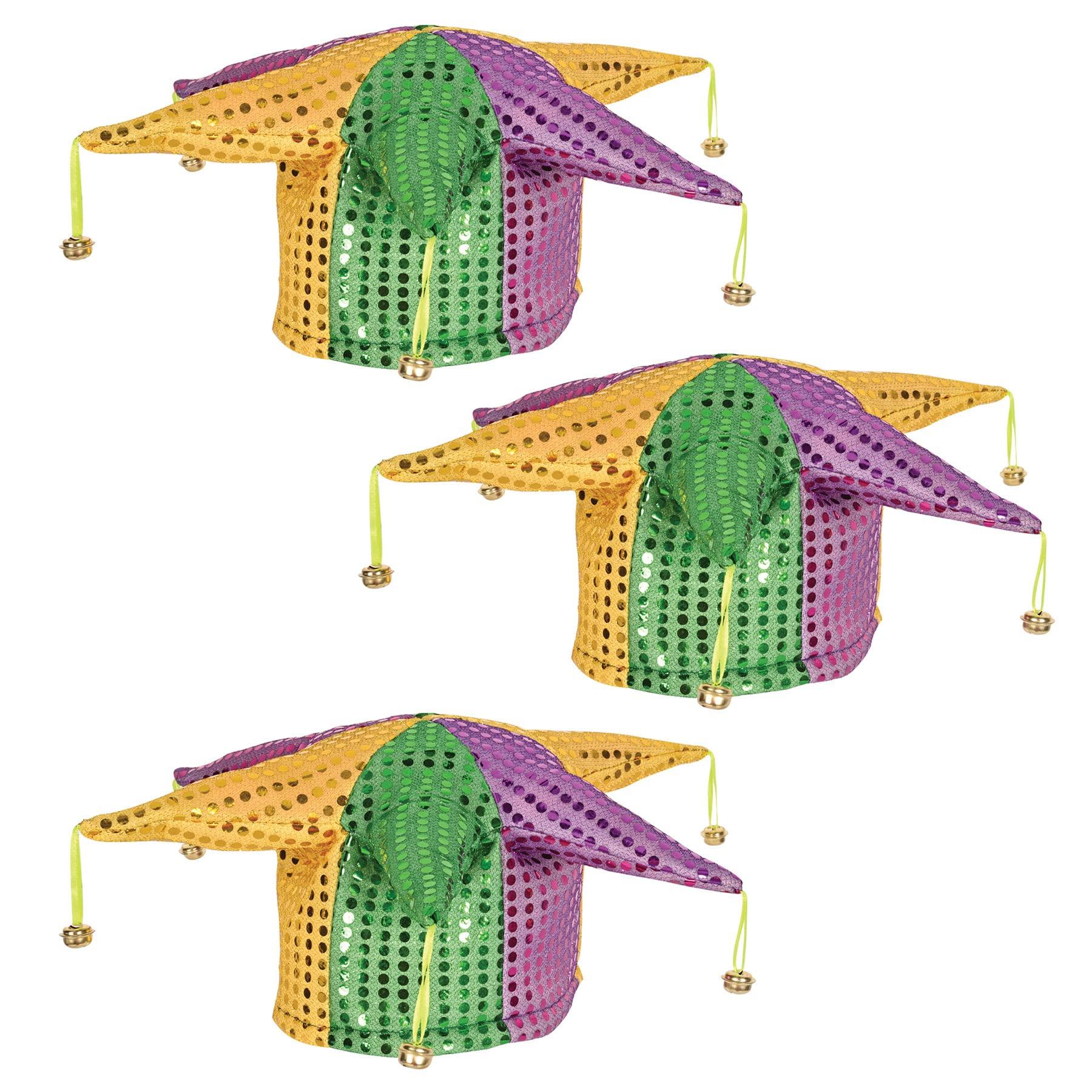 Includes 3 Jester Hats. These Mardi Gras Hats are made of sequined foam backed material and are in Green, Gold and Purple colors accented with gold bells on the points of the hat. One size fits most. These hats will bring excitement and fun to any Mardi Gras Party!