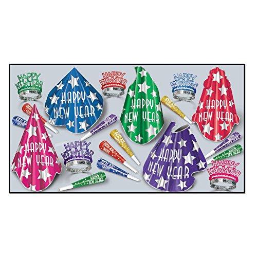 Beistle 88294-10 Midnight Star Assortment for 10 People. This colorful assortment contains enough items for 10 people to use. The assortment includes 5 pieces of printed foil boardstock party hats in assorted designs, 5 pieces of glittered tiaras and 10 pieces of 9 inch printed foil horns. This is a fun assortment to have at a New Years party for friends and family to use!.