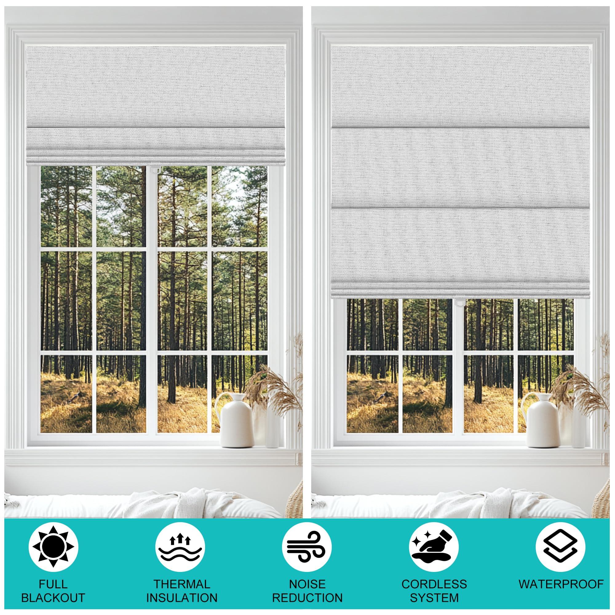 • Upgrade Technical Fabric window shadescordless room darkening roman shades are crafted from carefully selected premium durable fabric which offers a natural and high-end look. Cordless operation system makes it super easy to raise or lower the roman shades and can eliminate potential hazard to children and pets. Exquisite workmanship makes the stack very neat when the shade is raised. They are very easy to install with the clear instructions and also easy to clean and maintain.