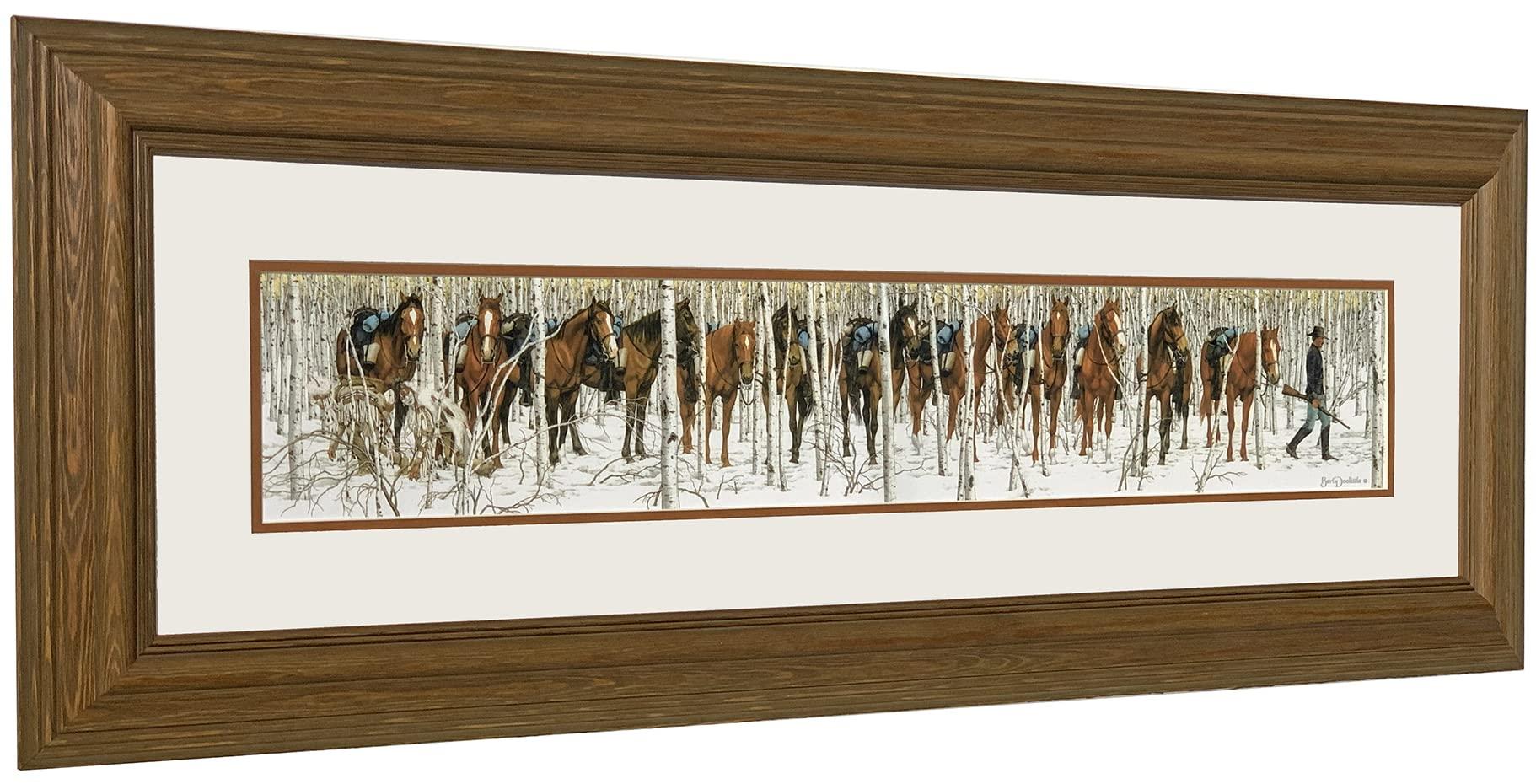 Two Indian Horses by Bev Doolittle This is an open edition art print. The image size is 24" x 4" The matted and framed size is 31 3/4" x 12" The top mat is off white and the bottom mat is rust. The high quality gallery frame is 2 1/8" wide. All of our art is professionally matted and framed using acid-free, museum quality archival materials in our own custom framing shop. We only use that mats are cotton rag that meet the Library of Congress standard for conservation. The mats are covered with uv light blocking plexi glass to protect the art from damaging uv light rays. The backing where the artwork will rest is acid free foam core. The back of the frame is protected and sealed with a dust cover. The braided picture wire is covered with vinyl and secured into the back of the frame. This print is ready to hang on your wall and comes complete with a recommended hanger. We buy our art from licensed publishers and art dealers. Please note that this is not the full size signed and numbered limited edition print that sells for around $5,000.00