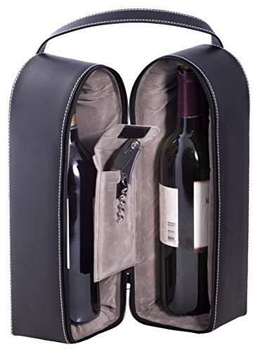 - The set features compartments for two bottles and includes a bar tool with corkscrew, bottle cap opener & foil