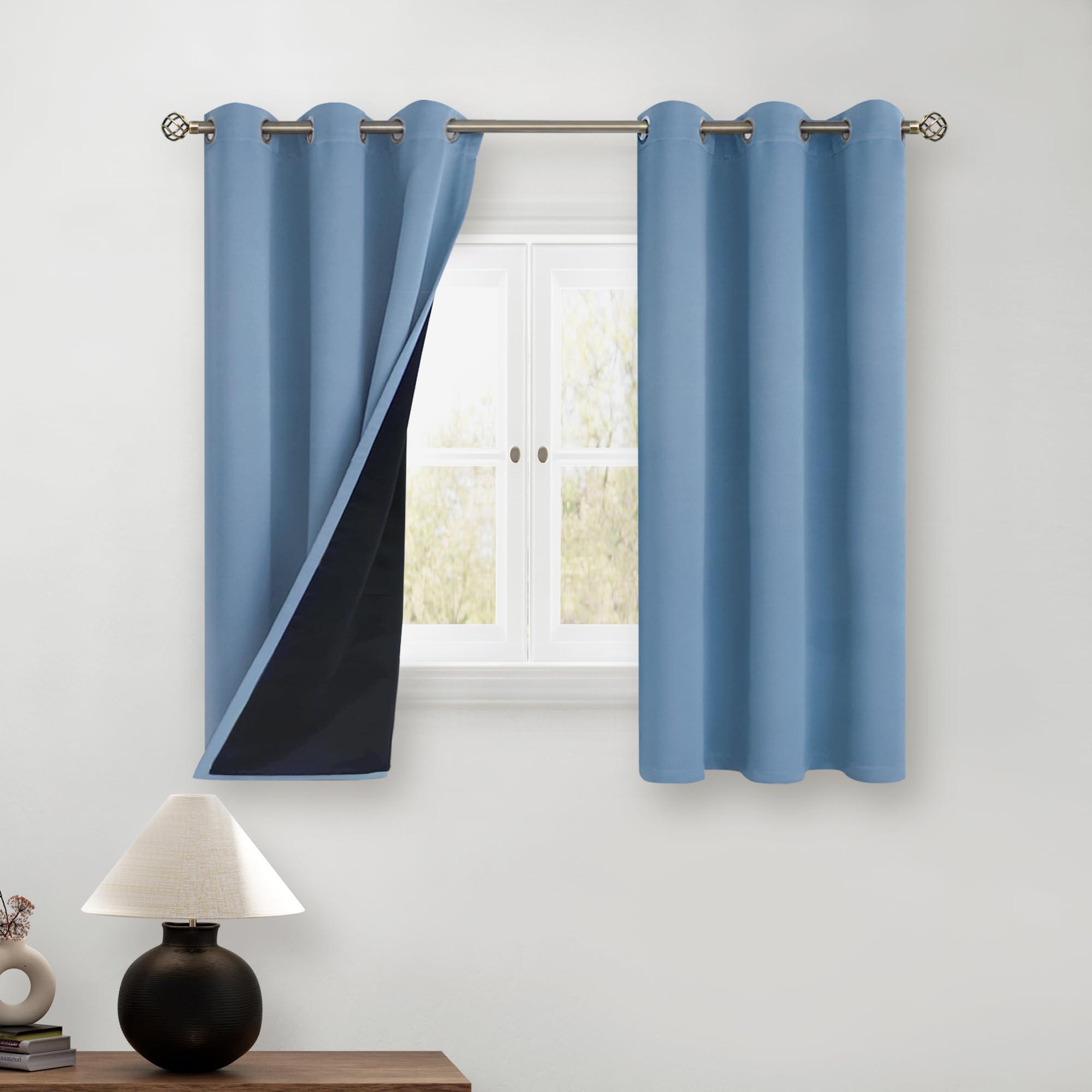- EASY TO INSTALL: Includes denim blue blackout curtains 2 panels set per package. Each panel measures 42 inches wide by 45 inches long, with 6 silver-color metal grommets on top, fit rods less than 1.6 inch diameter. Suggest choose the right size after measuring your windows.