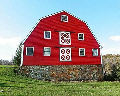 "Big Red Dairy Barn" is a digital color photograph that has been slightly manipulated with software to highlight certain characteristics of the image. Big Red Dairy Barn is a meticulously restored dairy barn now a residence. Its outstanding features are the two sets of double X brace sliding hay doors and wide Gambrel roof. Beautiful! This barn makes a magnificent home. I can't imagine what it took to restore it! The barn sits on a sloping lot, exposing a lovely old foundation. You can see where openings were filled in. The ribbon pointing was probably redone during the renovation, as well. The siding is painted a bright red and the trim a bright white. All of the windows are sixteen-pane, eight over eight double hung windows. The two sets of sliding barn doors are done in the double double-X style, meaning that there are double X braces on the top and bottom of each door. The doors are hung on metal sliders with oblong hangers with a pointed tip at the bottom. This barn had three working floors. The stone foundation includes multi-colored stone most likely from the area, that include some large slabs of rusty color. A touch of copper green appears around the window vent in the foundation. The sky is a robin's egg blue that fades to white at to horizon, with white clouds near the horizon. The trees have mostly lost their leaves, or are holding faded brown leaves. A single Norway Spruce raises is graceful boughs towards the sky in the front of the barn, to the left. Warm weather has left the grass green. The low sun created long, narrow shadows across the lawn. Additional print sizes are available, including small sizes for collage frames. Start your collage print collection today, and change out your photos with the seasons and holidays! Copyright information will not appear in your purchased print. No unauthorized use permitted. Copyright Anne M. Freeman. All rights reserved.