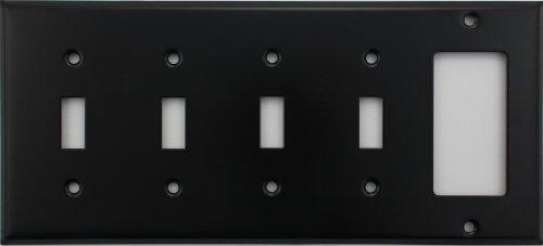 This wall plate is made of steel that is painted black and has a smooth texture. This five gang plate will accommodate four toggle switches and one GFI outlet, rocker switch, or any other rocker opening devise. plate measures 4 1/2" by 10"