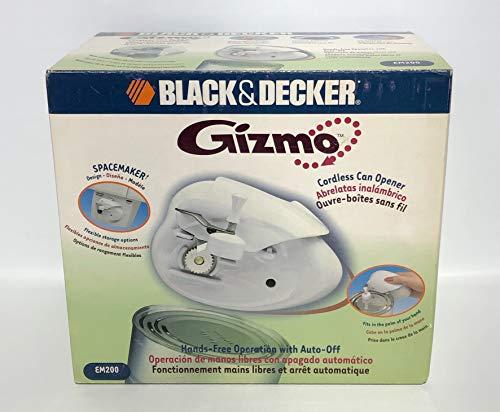 Black & Decker EM200/C Gizmo Cordless Can Opener. It has a spacesaver design, with flexible storage options. It has hands-free operation with auto-off. *Please Note: The copyright date on the box is 2001 (20 years ago). You will need to buy new batteries for this item.
