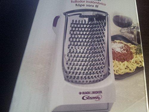 Black & Decker Cordless Gizmo Grater. Cordless freedom allows grating on top of your dish. Use the fine grating blade for Grates cheese, spices, citrus and more. Parts in contact with food are dishwasher safe. Versatile storage is perfect on the wall, in a drawer or on the counter.