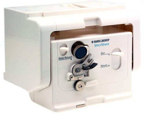 Convenient when in use, inconveniently taking up counter space when it's not, an electric can opener can be more trouble than it's worth. Black & Decker solves the problem with this compact model. It mounts underneath a cabinet, where space is wasted anyway, and, as if that weren't enough, the opener's face pulls down when it's needed and then snaps back up to conserve even more space--and to look neat and tidy. A magnet extends automatically to secure lids. For cleanup, the blade assembly pops off at the push of a button and can be put in the dishwasher. Made of gleaming white plastic, this can opener is barely noticeable and looks good when it is noticed. --Fred Brack