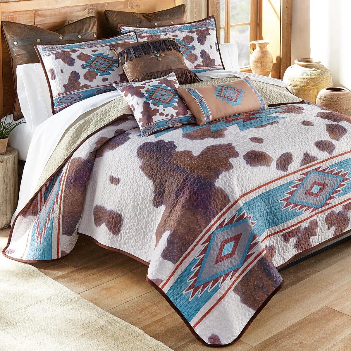 Bring the warmth and charm of the Southwest into your bedroom with the BLACK FOREST DECOR Aztec Cowhide Twin Quilt Set. This lightweight microfiber quilt set features a striking combination of cowhide and diamond geometric patterns, making it a perfect accent for any rustic or farmhouse-inspired decor. The set includes a 68"W x 86"L quilt and a 26"W x 20"L sham, offering a complete and cohesive bedding solution for your twin size bed. Made from soft and breathable microfiber, this quilt set provides cozy comfort throughout the year. Designed for practicality, the quilt set is machine washable, ensuring easy care and long-lasting use. Whether you're decorating a western-themed bedroom or simply love the look of cowhide prints, this quilt set is an excellent choice. It pairs well with a variety of decor styles, including country comforter sets, rustic western bedding, and farmhouse bedding. The BLACK FOREST DECOR Aztec Cowhide Twin Quilt Set brings together the best of southwestern style and modern comfort, making it a must-have for any home. Quilt: 68"W x 86"L; Sham: 26"W x 20"L