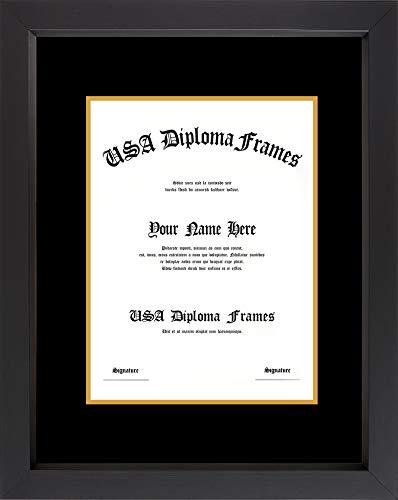 Note that this frame fits 11x14" vertical documents.The Black Matte Diploma Frame with black suede matting and gold accent is a popular choice that offers a traditional look that will compliment any home or office. The diploma frame is double-matted using an acid-free black suede mat and gold accent mat. The frame includes a pre-installed hanger so that you can quickly and easily display your document(s).