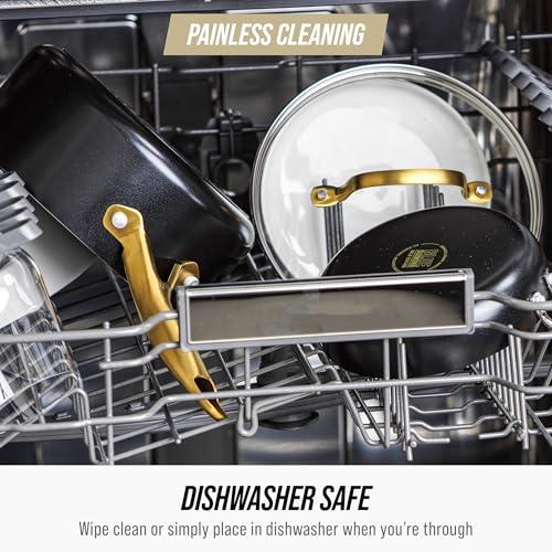 - STYLISH DESIGN: Gold-tone handles with wear and corrosion-resistant ceramic coating, tempered glass lids for a polished look.