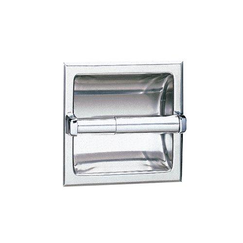 Type 304 stainless steel with one-piece seamless construction. Bright-polished finish. Chrome-plated plastic spindles hold rolls up to 5-18" (130mm) diameter (1500 sheets). Single-roll model measure 6-18" width by 6-18" Height (155 by 155mm). Mounting: clamps for securing to stud walls or countertop aprons.Rough wall opening: 5-12" width by 5-14" height by 3-38" minimum depth (140 by 135 x 85mm). Shell and Flange - 18-8 S, type-304, 22-gauge (0.8mm) stainless steel. Drawn, one-piece, seamless construction with two countersunk mounting holes. Support Posts (2) - Heavy-duty cast zamak with chrome-plated finish. Mounting Bracket - Plated steel mounting clamp attaches to back of unit with two sheet-metal screws for installation in stud wall construction and countertop aprons. Spindle - Chrome-plated plastic equipped with heavy-duty internal spring.